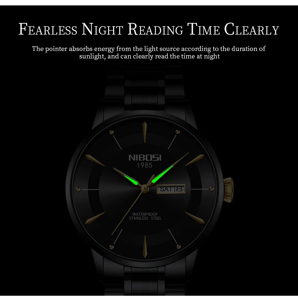 NIBOSI Fashion Cool Black Quartz Watch for Men Luxury Stainless Steel Waterproof Luminous Date Week Mens Watch Relogio Masculino
